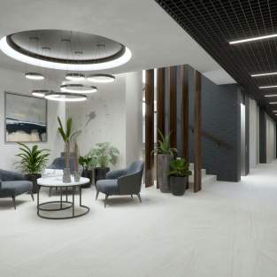 Здание выполнено с использованием витражного остекления и натурального травертина, что придаёт фасаду изысканный внешний вид. Внутренние общественные зоны оформлены керамогранитом, создавая атмосферу комфорта и современности.